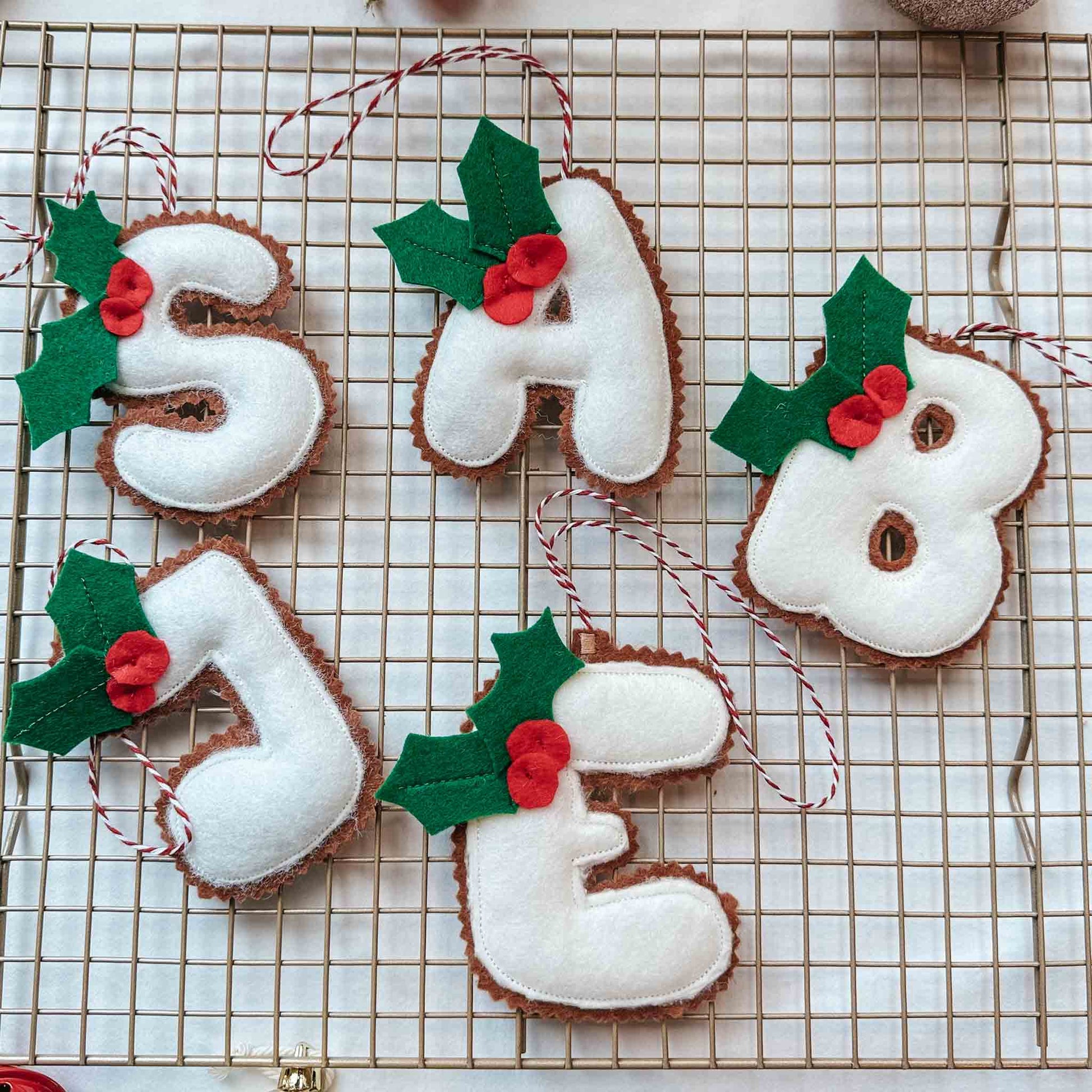 Cozy, handmade felt letter ornaments designed to look like sweet iced gingerbread cookies! Puffy, soft, and decorated with festive holly details — perfect for names, initials, stockings, and personalized holiday décor.
