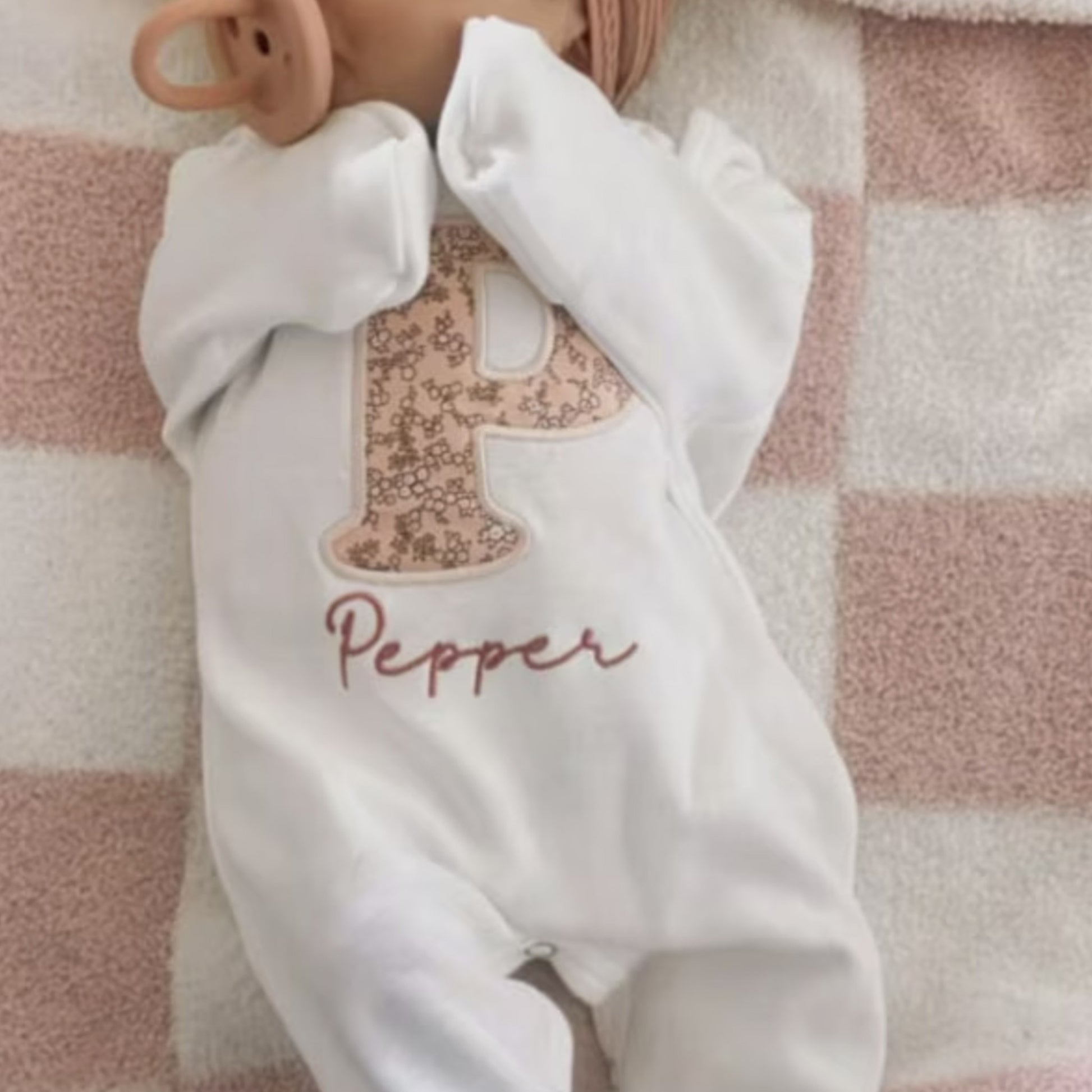 This features, a white romper, a large initial in pink, mauve floral and name in mauve color under the initial.