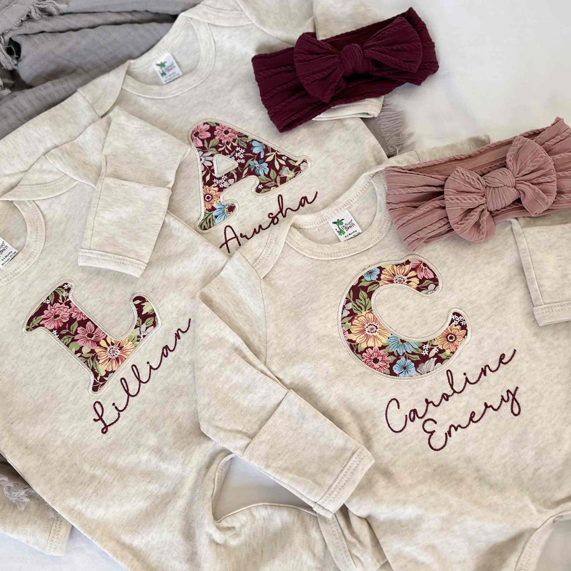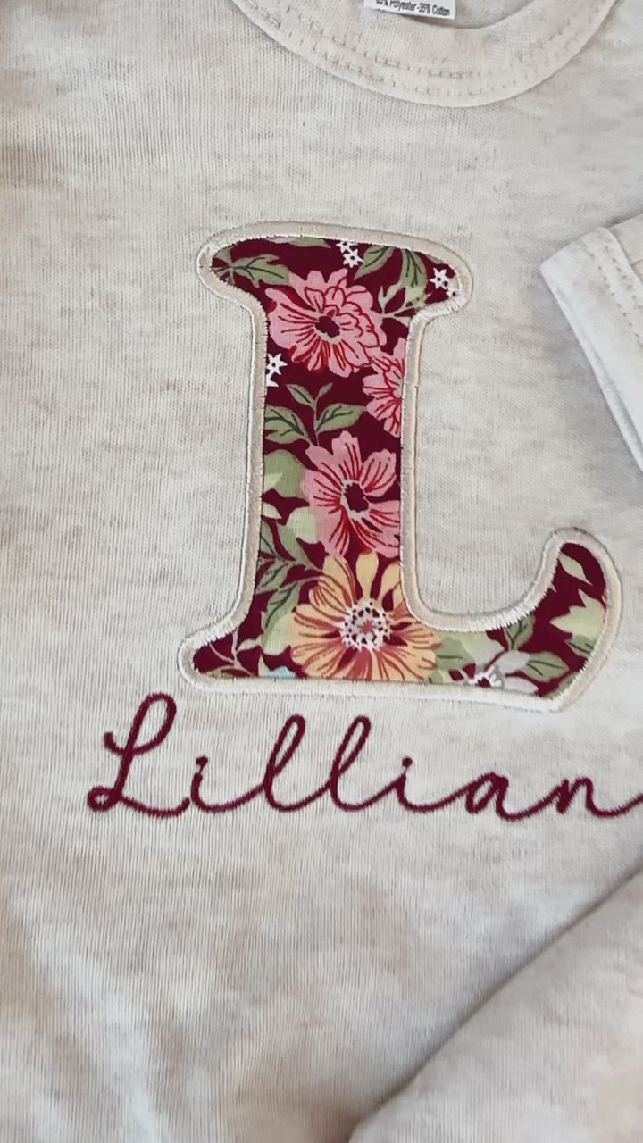 This features an oatmeal melange romper, a large initial in Maroon, pink , yellow and green floral pattern and name in Purple color under the initial.